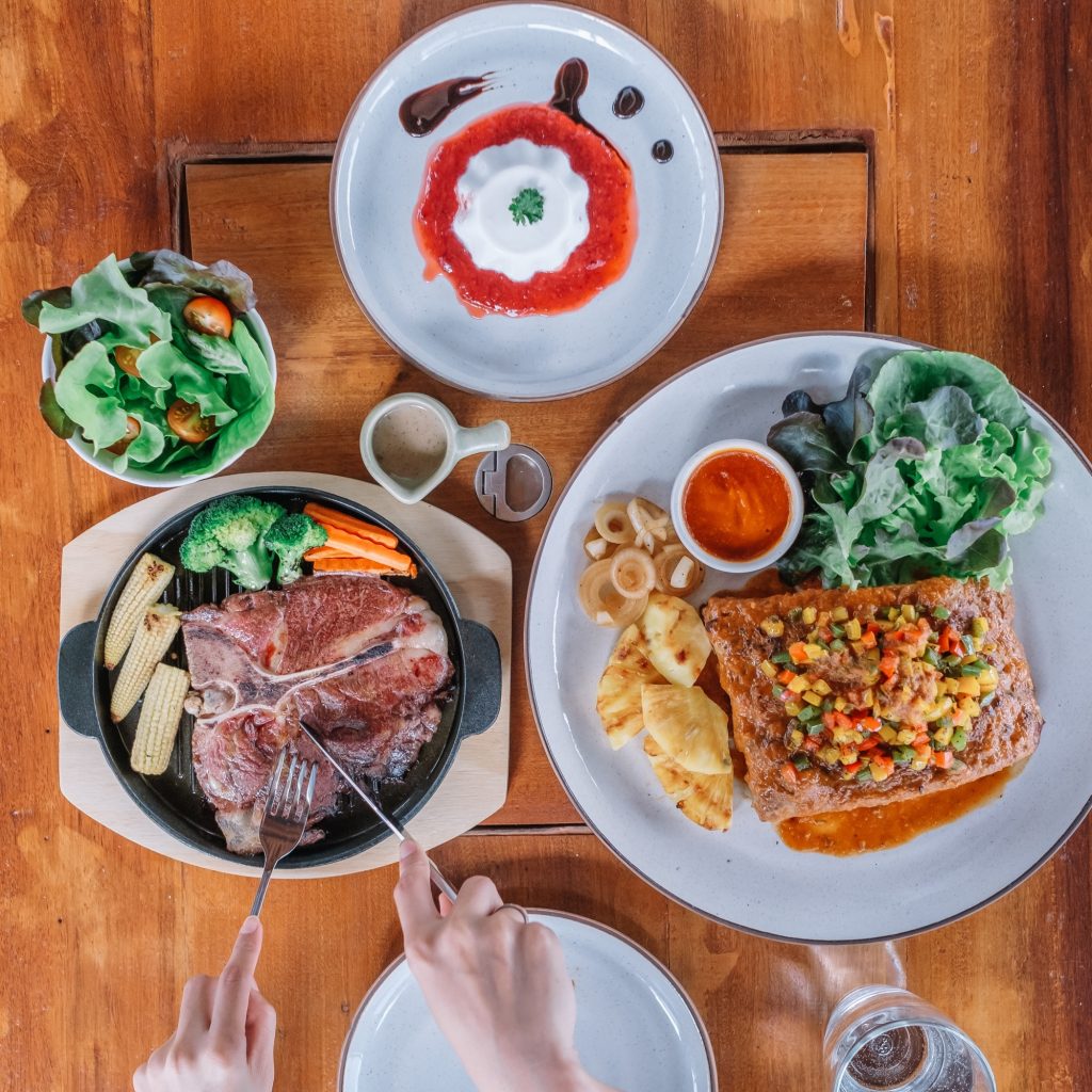 เมนูอาหารแนะนำก็จะเป็นซี่โครงหมูย่างซอสพริกหวานสมุนไพร จัดมาแบบชิ้นใหญ่เต็มคำ และทีโบนสเต็กที่อร่อยไม่แพ้กัน ตบท้ายด้วยของหวานอย่างเมนูพานาคอตต้า ก็อิ่มอร่อยแบบครบทุกรสชาติ