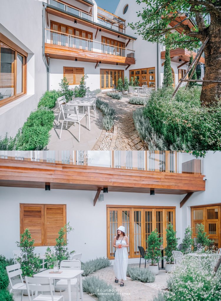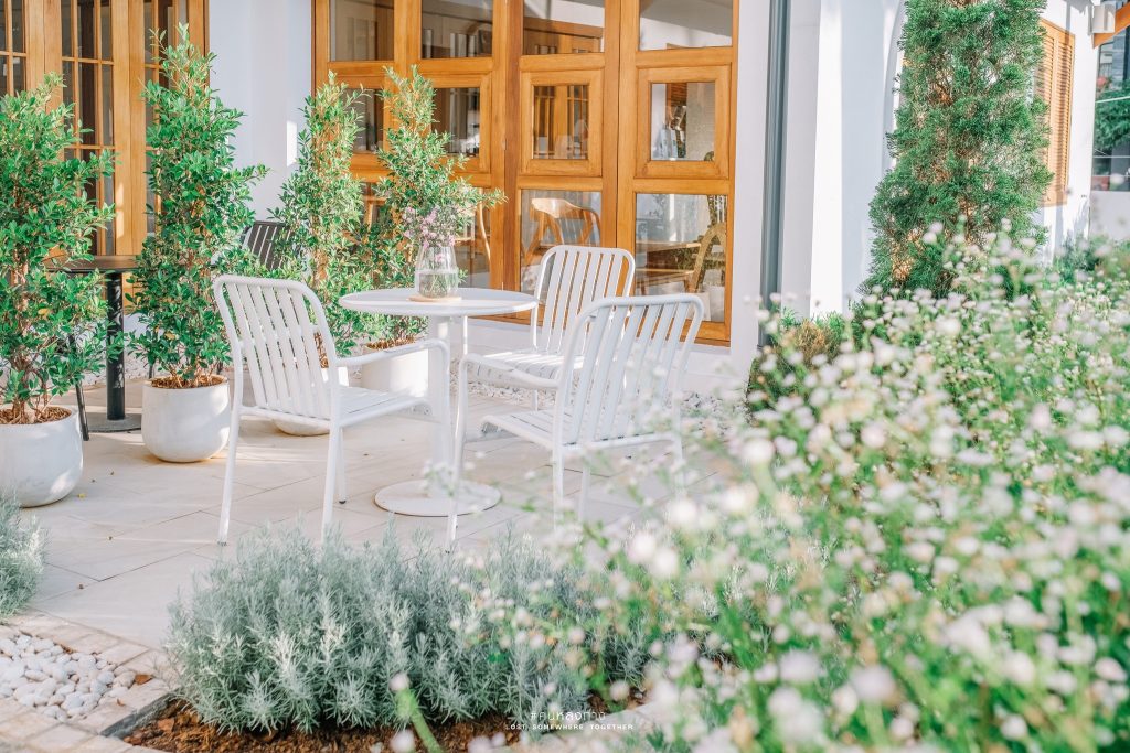 ด้านหน้าจะมีมุมนั่งเล่นกลางสวนซึ่งตกแต่งไว้เป็นสวนน่ารักๆ สไตล์อังกฤษ ฟีลเหมือนมานั่งจิบ Afternoon Tea ยามบ่าย บรรยากาศร่มรื่น สวนสวยมากๆ ดูสบายตา