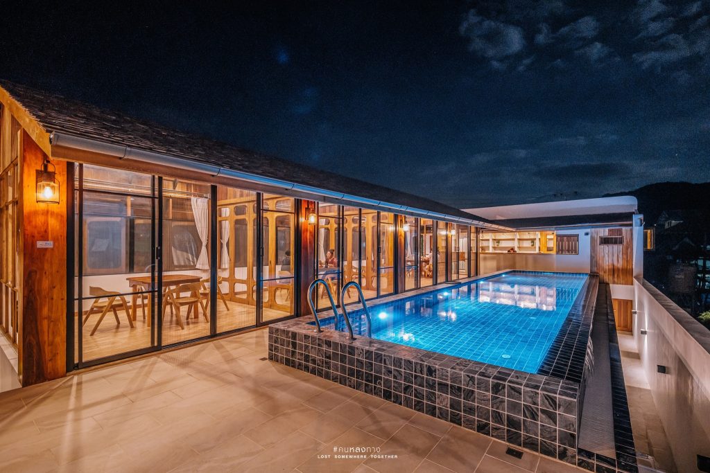 มุมสระว่ายน้ำตอนกลางคืนซึ่งจะอยู่ตรงด้านหน้าห้องอาหารชั้นบน วิวดีสุดๆ