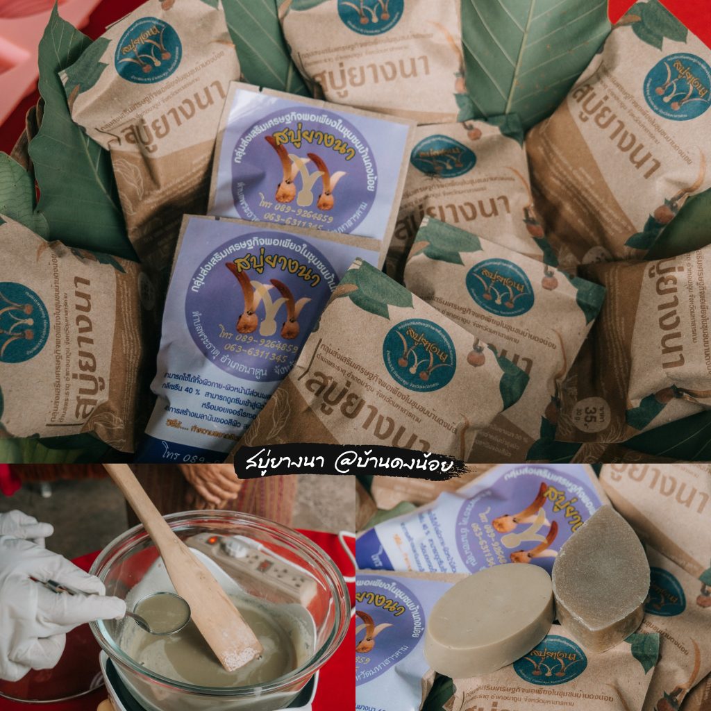 แต่ชาวบ้านที่นี่ก็ได้มีการนำมาสร้างสรรค์ทำเป็นสบู่ยางนา ที่ทั้งอ่อนโยน และผลิตจากธรรมชาติ ใช้ได้ทั้งผิวหน้าและผิวกาย เป็นมอยเจอร์ไรเซอร์ช่วยบำรุงผิวเนียนนุ่นชุ่มชื่น และกระจ่างใสขึ้น ในราคาอันแสนย่อมเยาว์