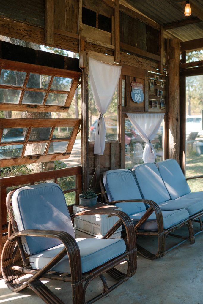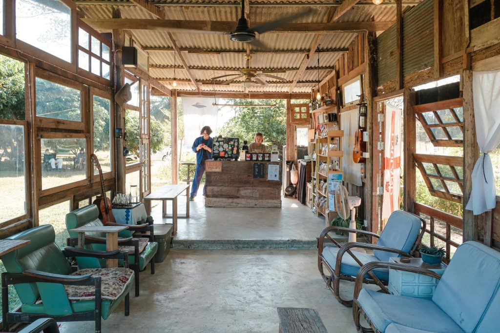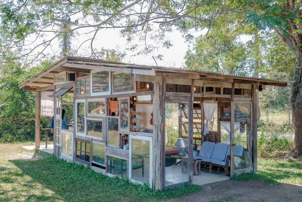 ตัวร้านนั้นจะเป็น Glass house ที่ทำมาจากประตู - หน้าต่างบานกระจกเก่าทั้งหมด ภายในก็จะมีมุมที่นั่งตกแต่งสไตล์วินเทจ ดูอบอุ่นเข้ากัน ส่วนที่นั่งด้านนอกก็จะทำเป็นแนวแคมป์ปิ้งให้ได้นั่งเล่นกลางสวนกันครับ
